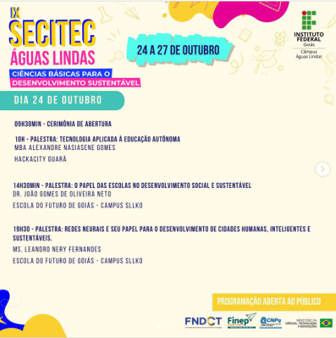 O Instituto Federal de Goiás, Campus de Águas Lindas, realizou a IX SECITEC – Ciências Básicas para o Desenvolvimento Sustentável nos dias 24 a 27 de outubro.